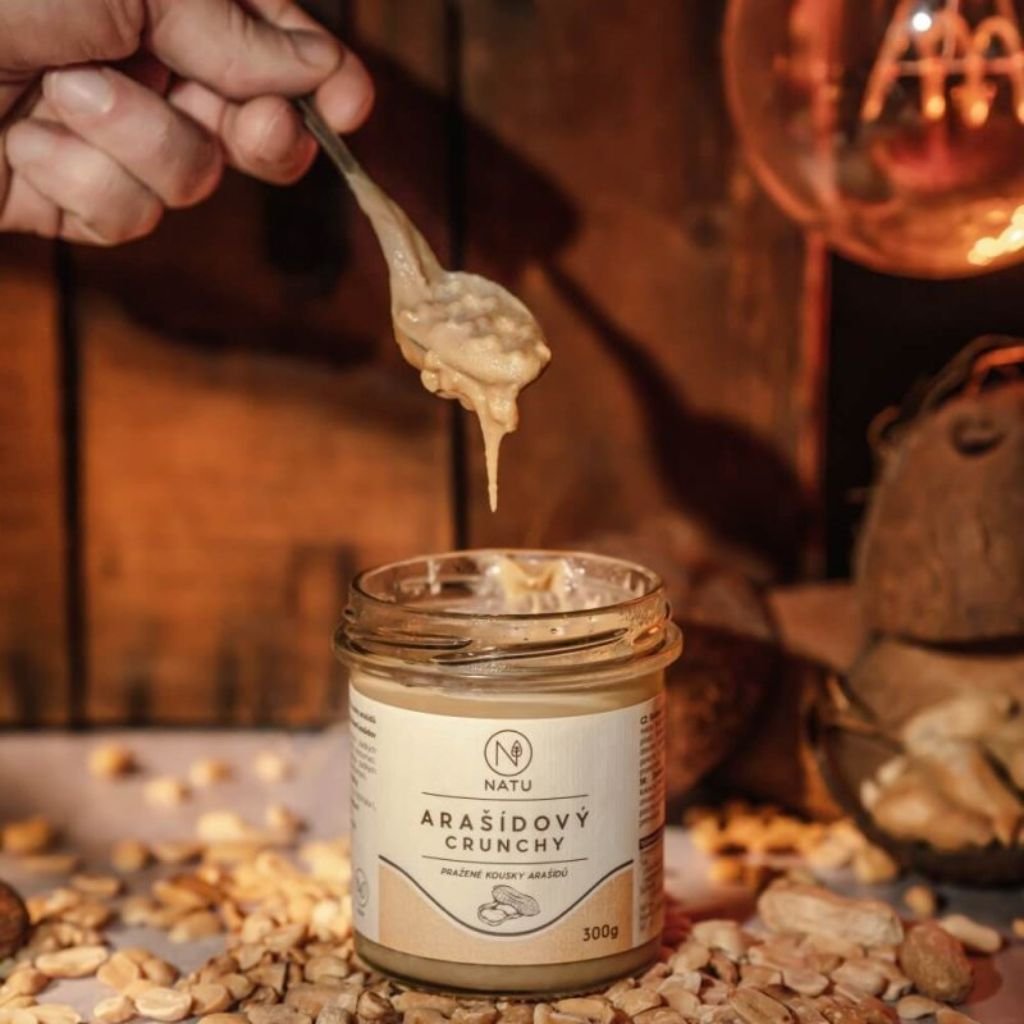 NATU Arašidový krém crunchy 300 g je lahodný orieškový krém, v ktorom sa spája jemná pasta z pražených arašidov s jemne nasekanými, chrumkavými kúskami. Výroba sa zakladá len na dvoch základných ingredienciách: 91 % pražené arašidy (podzemnica olejná) a kokosový nektár, bez pridaného cukru, soli či toxických prísad. Je ideálny na natieranie, do smoothie, do raňajkovej kaše či na pečenie.